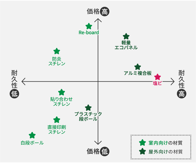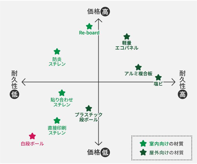 パネルキングでよく利用される「展示会・イベント」「店舗販促」「屋外・常設」の 3 つの用途に適した材質やオプションをご紹介します。