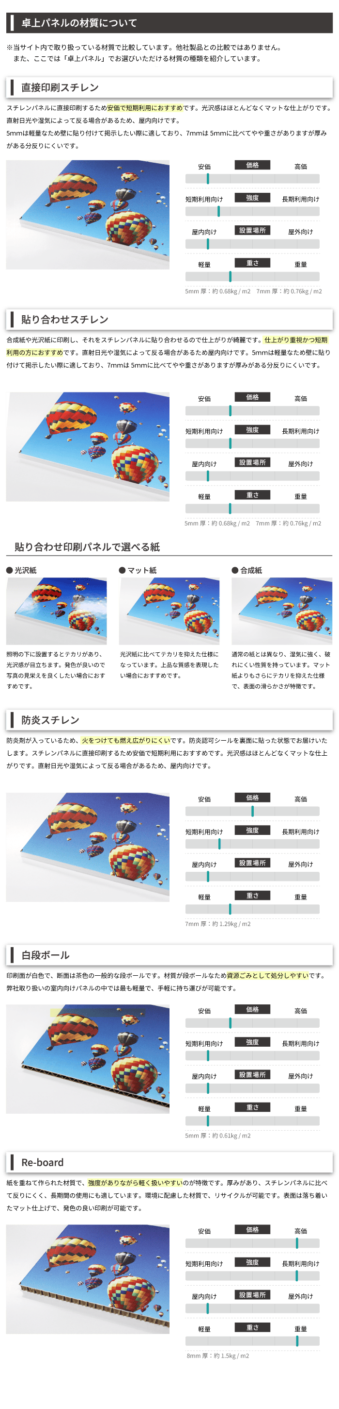 スチレンパネルに直接印刷するため安価で短期利用におすすめです。光沢感はほとんどなくマットな仕上がりです。直射日光や湿気によって反る場合があるため、屋内向けです。5mmは軽量なため壁に貼り付けて掲示したい際に適しており、7mmは 5mmに比べて重さがありますが厚みがある分反りにくいです。