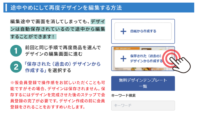 作ったデザインは自動保存されます。同じ手順で再度デザイン作成画面まで行けば、過去に作ったデザインを選んで続きから編集できます!